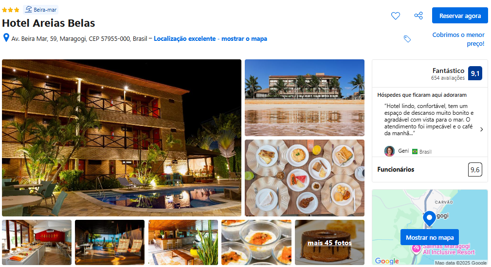 O Hotel Areias Belas é uma das hospedagens mais tradicionais de Maragogi, localizado de frente para o mar, no centro da cidade. Com uma vista privilegiada e estrutura completa, o hotel combina conforto, praticidade e um ótimo atendimento. É uma excelente escolha para quem quer aproveitar o mar sem abrir mão da comodidade de estar perto de tudo.